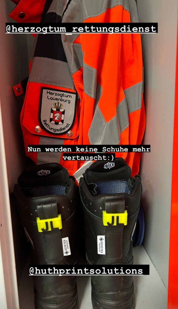 Die Namenschilder werden aus robustem PLA mit einem 3D-Drucker hergestellt. Sie werden dann einfach an die Schlaufe deiner Schuhe geklemmt – ganz ohne kleben. Durch ihre passgenaue und stabile Form sind sie allen Anforderungen des Retter-Alltages gewappnet.